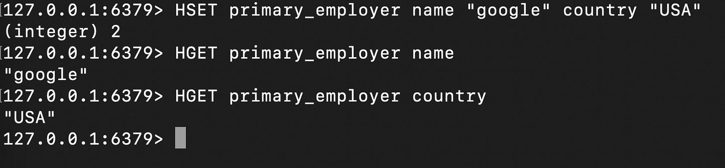 Hashes are maps between fields and values, where each field-value pair is stored within a single key.
